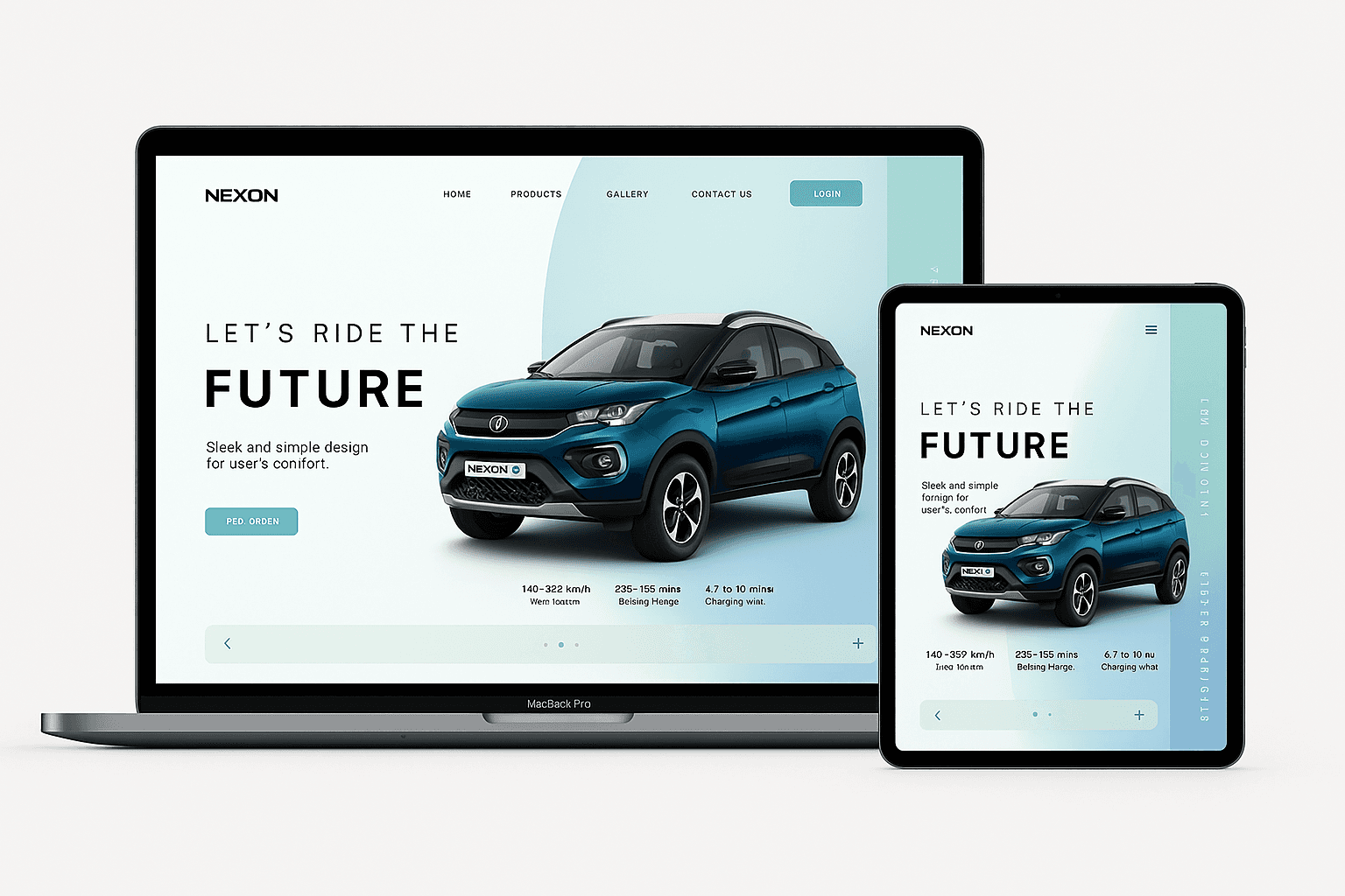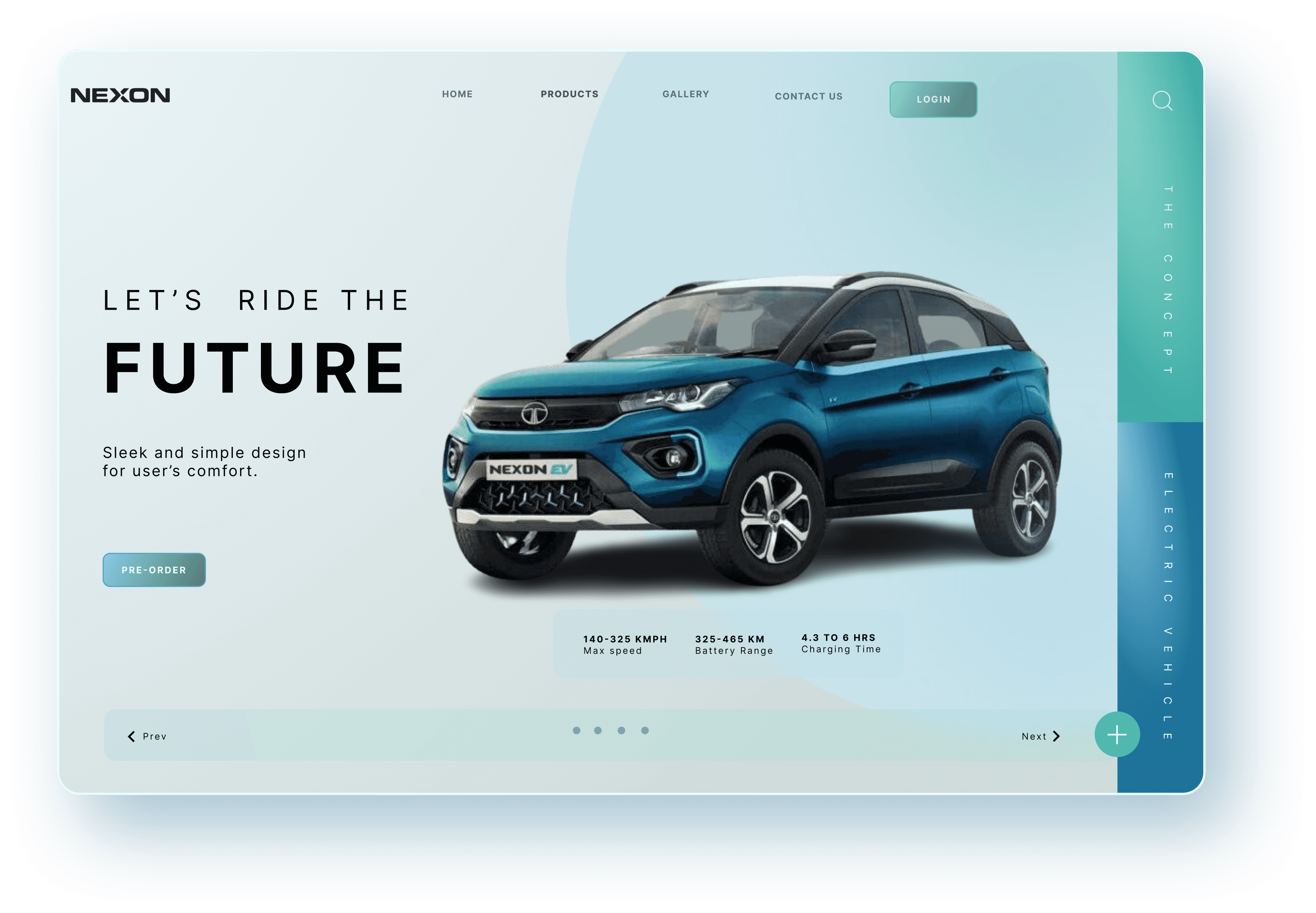 This project presents a sleek and futuristic website UI design for the Nexon EV. Built with a minimal and clean layout, the interface is tailored for an intuitive browsing experience, putting emphasis on the vehicle’s features like speed, battery range, and charging time. The design uses a soft color palette and spacious layout to create a calming and premium feel, aligning with the modern electric vehicle market. Interactive elements like “Pre-Order” and “Login” buttons enhance user engagement while maintaining clarity and functionality.