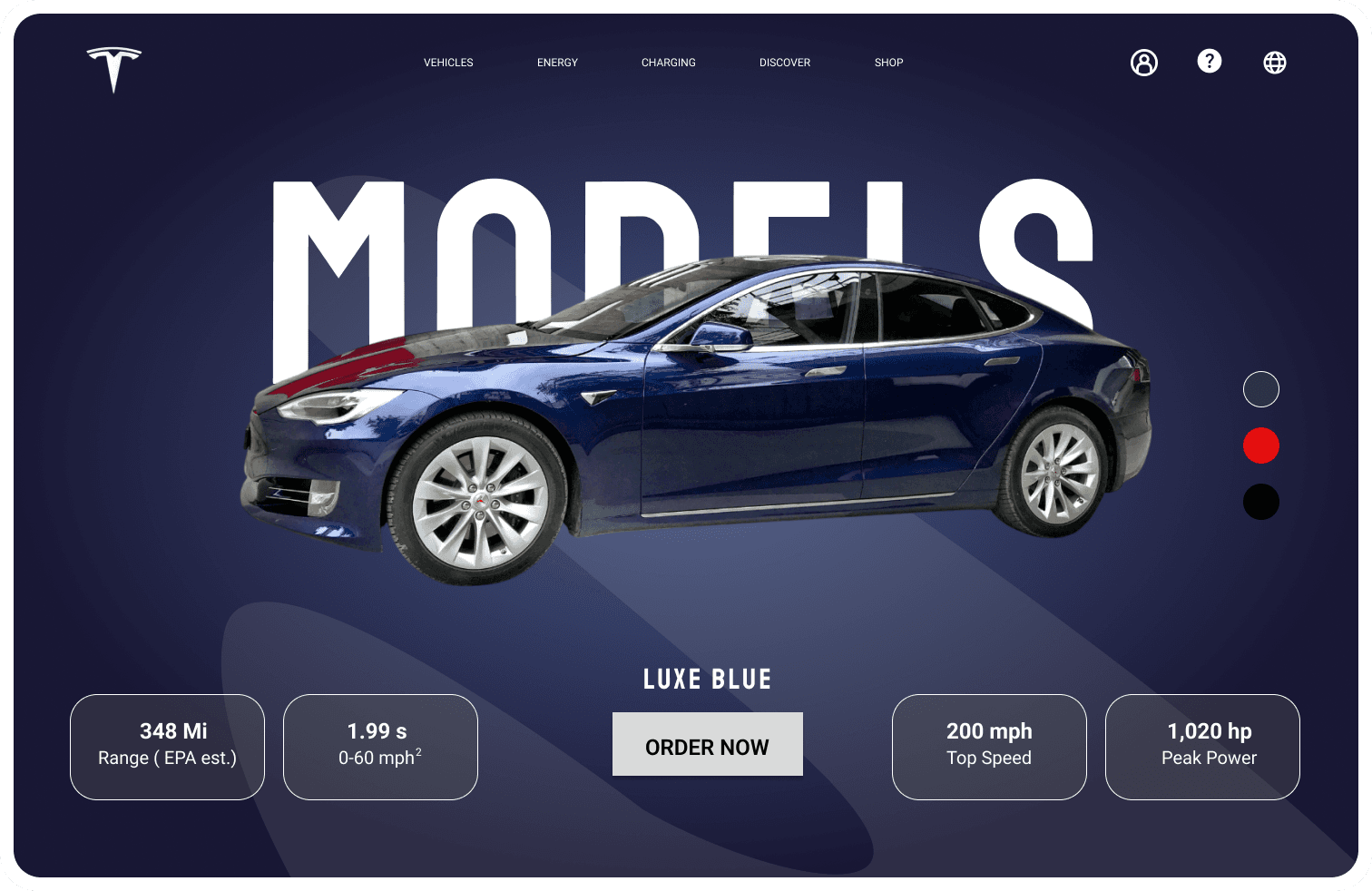 This concept explores an interactive Tesla Models UI where users can drag or swipe to instantly switch car colors, view specifications, and explore models with smooth motion transitions. The goal was to recreate a premium automotive digital experience that feels modern, fast, and immersive.