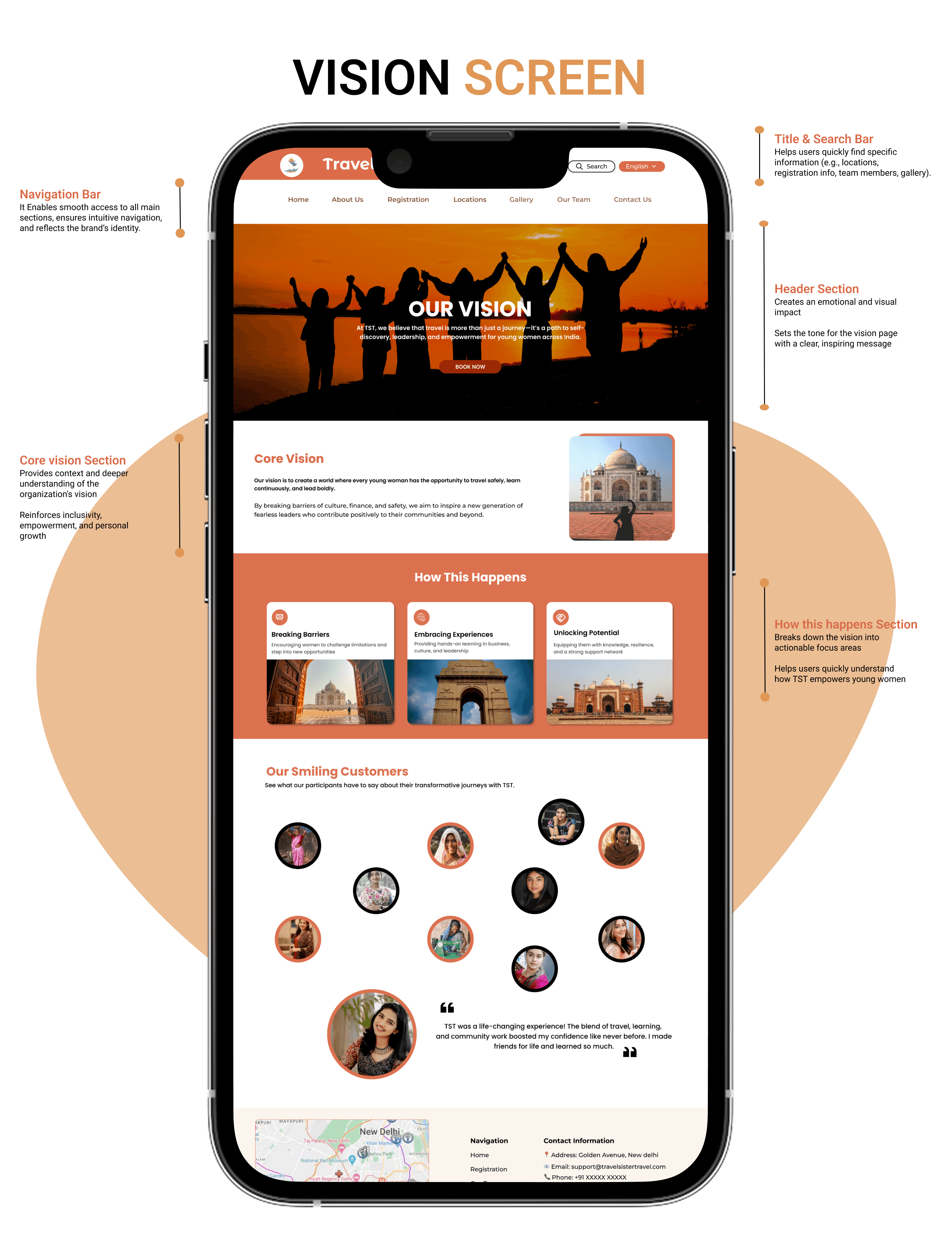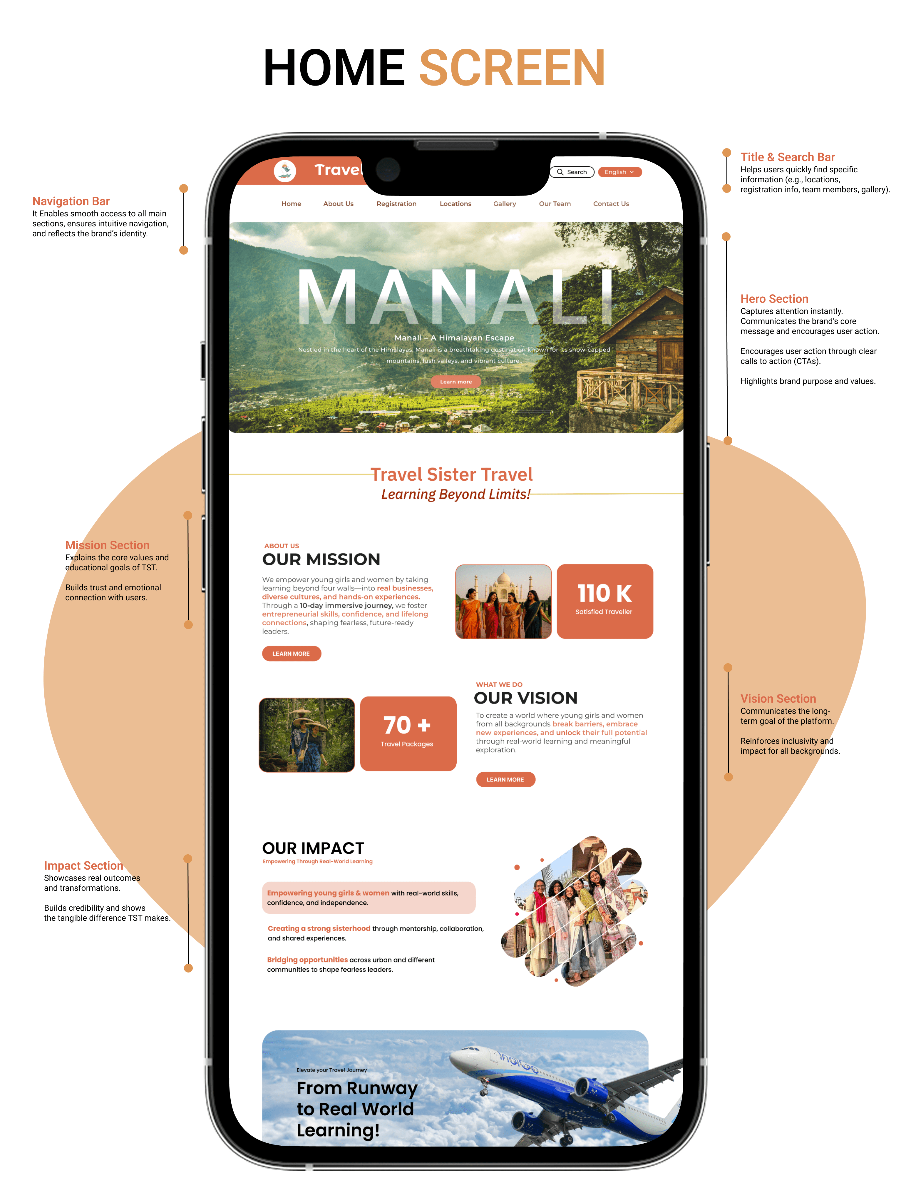 Travel Sisters Travel (TST) is a platform designed to address these challenges by offering safe, guided travel experiences exclusively for young women. It provides a user-friendly website where users can explore destinations, register for trips, learn about the organization’s mission, view a gallery of past events, connect with the team, and make secure payments. The design ensures intuitive navigation, visually engaging content, and secure booking options, making it easy for young women to embark on transformative journeys that foster learning, leadership, and community engagement.